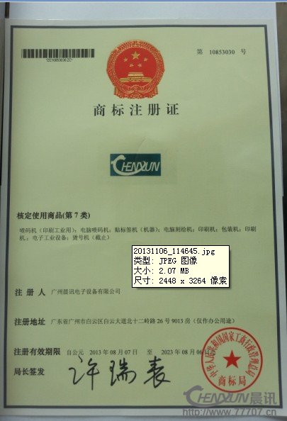 【晨訊噴碼機(jī)】英文商標(biāo)獲商標(biāo)局簽發(fā)